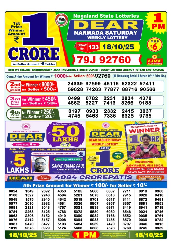 Dear Narmada Saturday Weekly Lottery 18.10.25 1pm Result