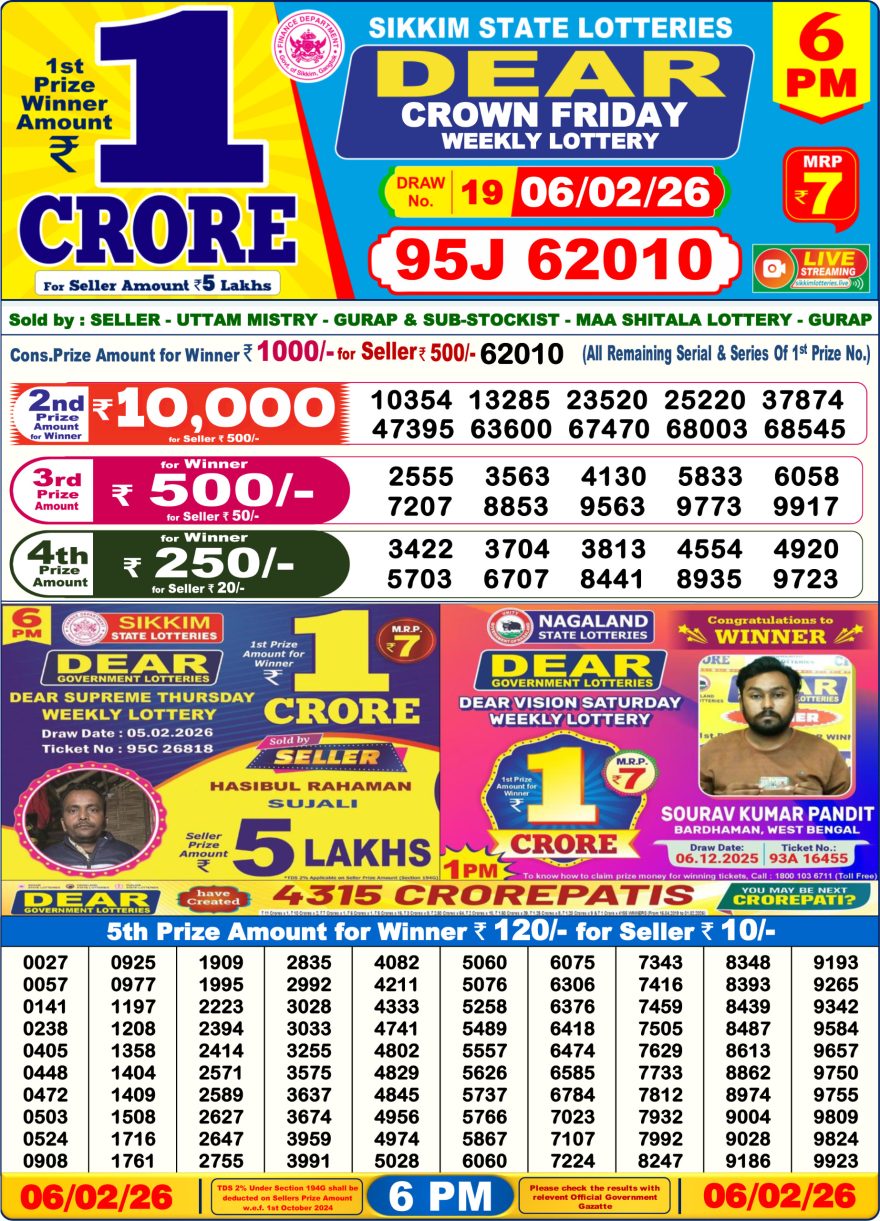 Dear Crown Friday Weekly Lottery 06.02.26 6pm Result February 6, 2026 Leave a Comment on Dear Crown Friday Weekly Lottery 06.02.26 6pm Result Get Instant Results on Whatsapp Related Articles 0 657 Dear Dasher Friday weekly lottery 11.4.25 6pm result 0 471 Dear Crown Friday Weekly Lottery 30.01.26 6pm Result 0 456 Dear Dasher Friday Weekly Lottery 12.09.25 6pm Result 0 216 Dear Dasher Friday Weekly Lottery 26.09.25 6pm Result