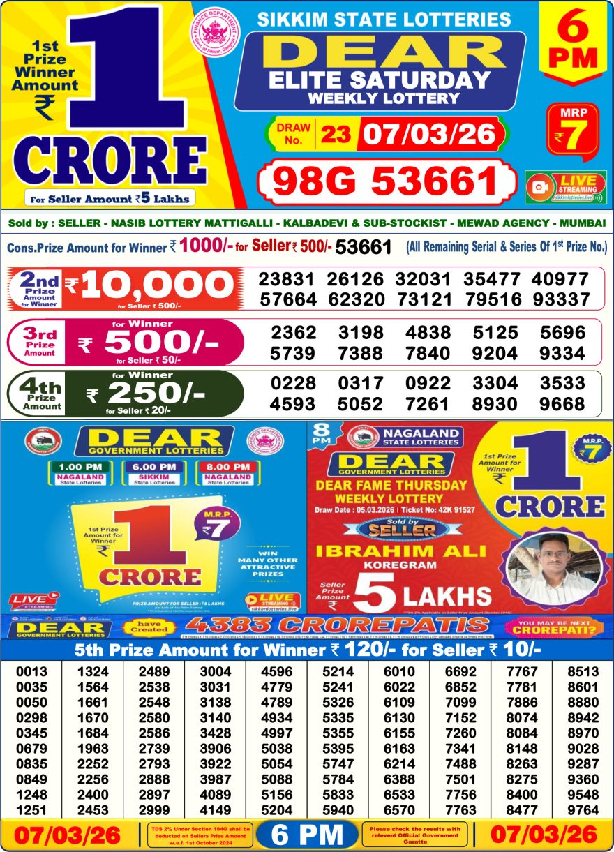Dear Elite Saturday Weekly Lottery 07.03.26 6pm Result March 7, 2026 Leave a Comment on Dear Elite Saturday Weekly Lottery 07.03.26 6pm Result Get Instant Results on Whatsapp Related Articles 0 783 Dear comet Tuesday weekly lottery 4.3.25 6pm result 0 527 Dear Legend Monday Weekly Lottery 19.01.26 6pm Result 0 126 Dear Regal Wednesday Weekly Lottery 01.04.26 6pm Result 0 540 Dear Vixen Sunday Weekly Lottery 10.08.25 6pm Result