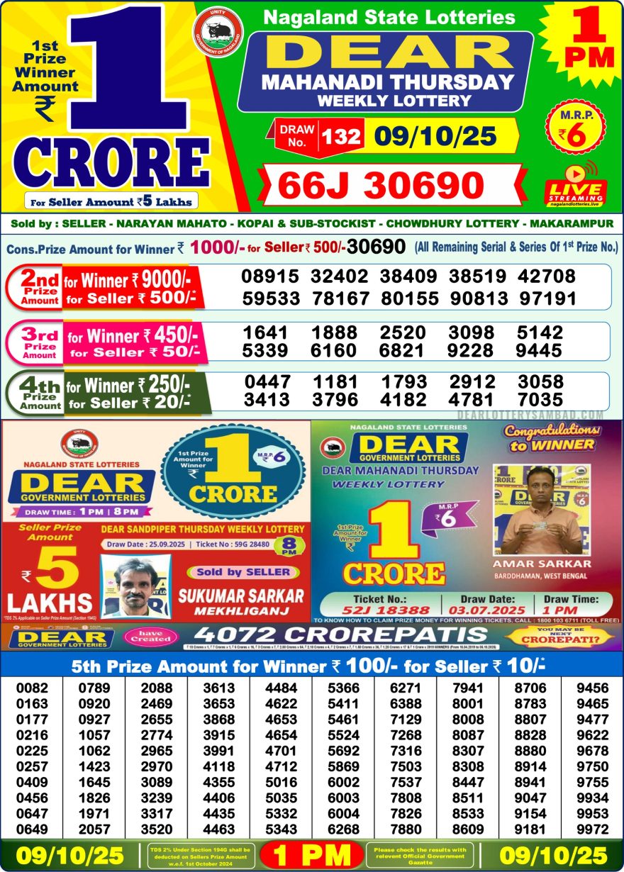 Dear Mahanadi Thursday Weekly Lottery 09.10.25 1pm Result