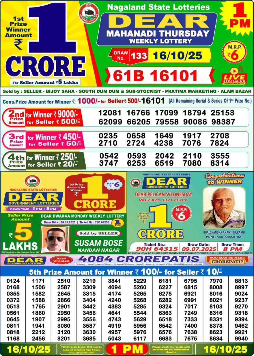 Dear Mahanadi Thursday Weekly Lottery 16.10.25 1pm Result