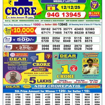 Dear Narmada Saturday Weekly Lottery 13.09.25 1pm Result September 13, 2025 Leave a Comment on Dear Narmada Saturday Weekly Lottery 13.09.25 1pm Result Get Instant Results on Whatsapp Related Articles 0 851 Dear mahanadi Thursday weekly lottery 8.5.25 1pm result 0 331 Dear Indus Wednesday Weekly Lottery 30.07.25 1pm Result 0 473 Dear yamuna sunday weekly lottery 01.06.25 1pm result 0 13 Dear Victory Friday Weekly Lottery 12.12.25 1pm Result