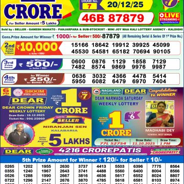 Dear Narmada Saturday Weekly Lottery 20.09.25 1pm Result September 20, 2025 Leave a Comment on Dear Narmada Saturday Weekly Lottery 20.09.25 1pm Result Get Instant Results on Whatsapp Related Articles 0 621 Dear dwarka monday weekly lottery 5.5.25 1pm result 0 600 Dear godavari Tuesday weekly lottery 4.3.25 1pm result 0 15 Dear Vision Saturday Weekly Lottery 20.12.25 1pm Result 0 659 Dear yamuna sunday weekly lottery 5.1.25 1pm result