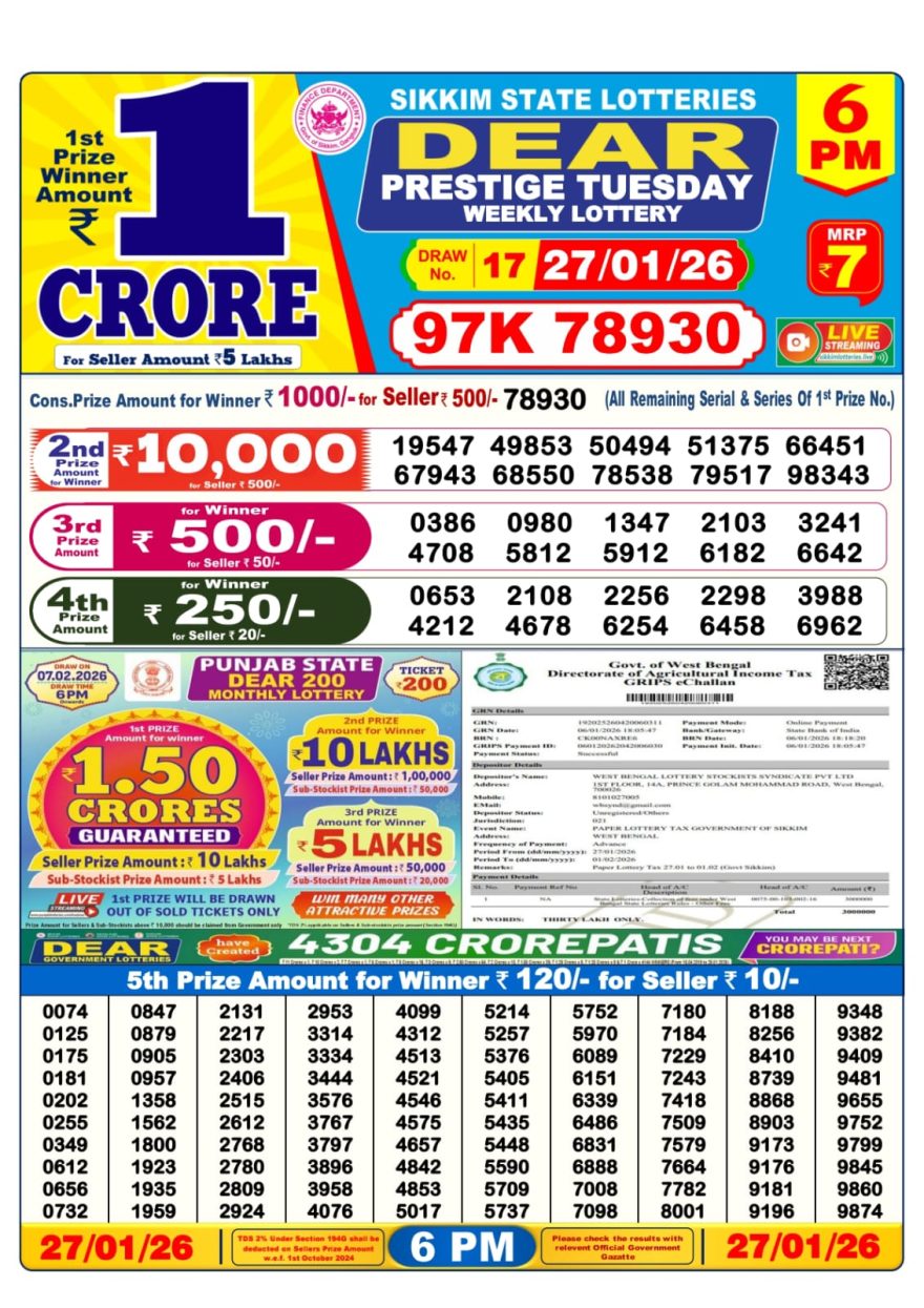 Dear Prestige Tuesday Weekly Lottery 27.01.26 6pm Result January 27, 2026 Leave a Comment on Dear Prestige Tuesday Weekly Lottery 27.01.26 6pm Result Get Instant Results on Whatsapp Related Articles 0 823 Dear comet Tuesday weekly lottery 25.2.25 6pm result 0 577 Dear vixen sunday weekly lottery 25.05.25 6pm result 0 561 Dear blitzen monday weekly lottery 5.5.25 6pm result 0 697 Dear vixen sunday weekly lottery 2.3.25 6pm result