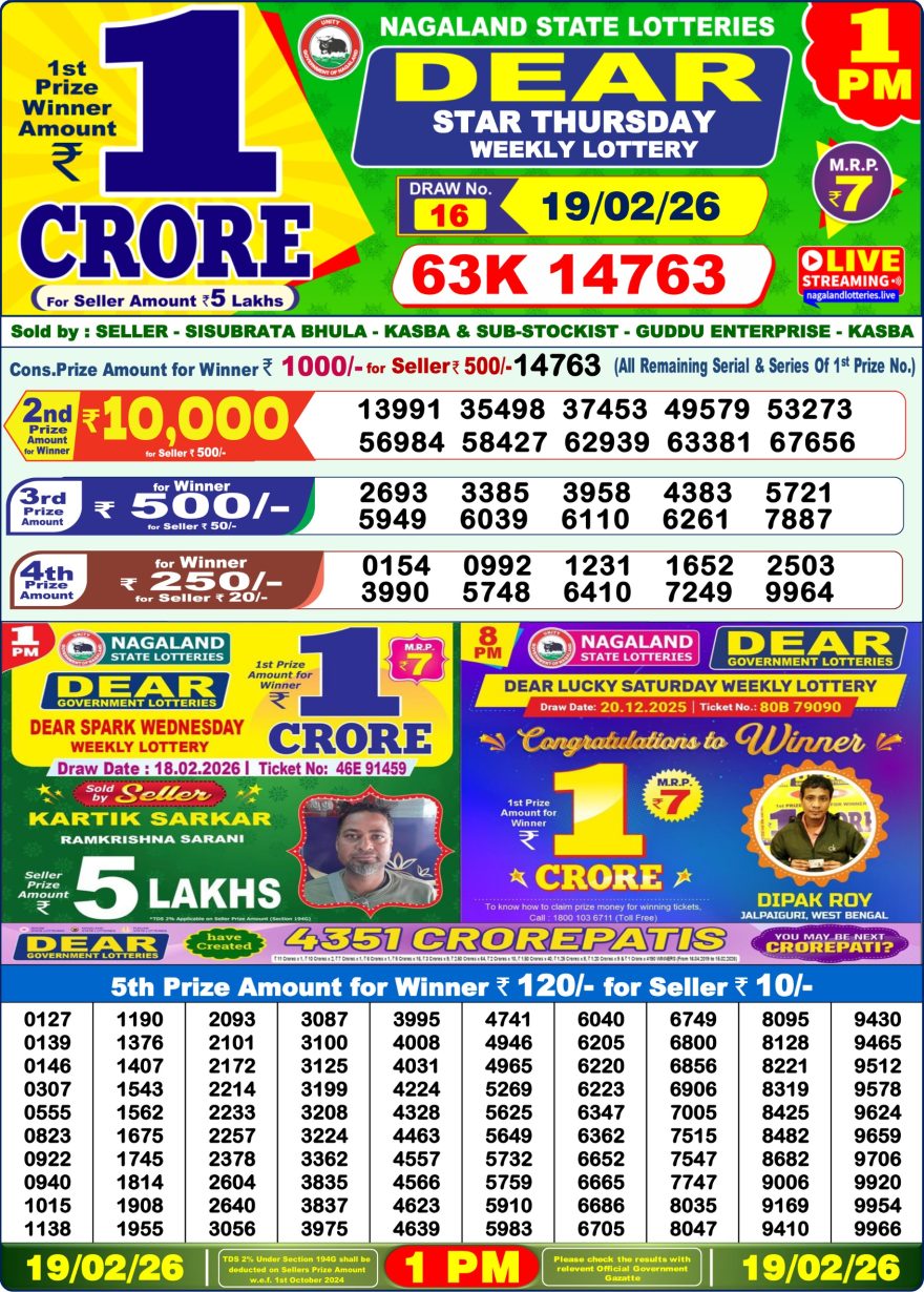 February 19, 2026  Leave a Comment on Dear Star Thursday Weekly Lottery 19.02.26 1pm Result