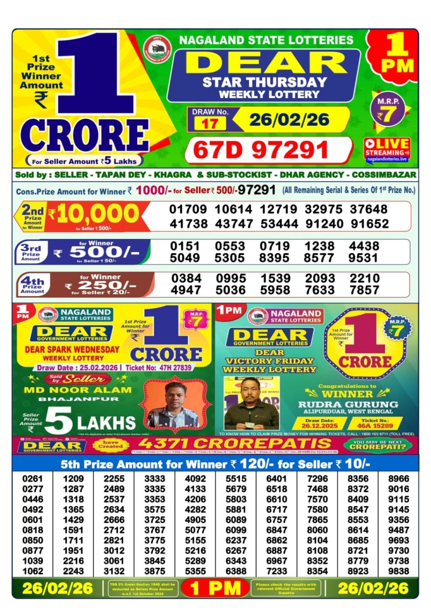 Dear Star Thursday Weekly Lottery 26.02.26 1pm Result February 26, 2026 Leave a Comment on Dear Star Thursday Weekly Lottery 26.02.26 1pm Result Get Instant Results on Whatsapp Related Articles 0 899 Dear yamuna sunday weekly lottery 19.1.25 1pm result 2 845 Dear mahanadi Thursday weekly lottery 6.3.25 1pm result 0 507 Dear Victory Friday Weekly Lottery 13.02.26 1pm Result 0 131 Dear Spark Wednesday Weekly Lottery 11.03.26 1pm Result