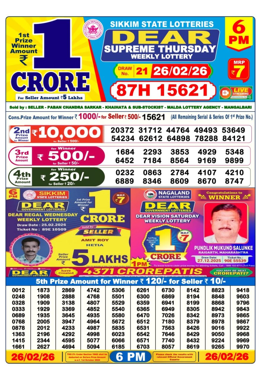 Dear Supreme Thursday Weekly Lottery 26.02.26 6pm Result February 26, 2026 Leave a Comment on Dear Supreme Thursday Weekly Lottery 26.02.26 6pm Result Get Instant Results on Whatsapp Related Articles 0 562 Dear cupid wednesday weekly lottery 09.07.25 6pm result 0 563 Dear vixen sunday weekly lottery 22.06.25 6pm result 0 644 Dear Prestige Tuesday Weekly Lottery 03.02.26 6pm Result 0 834 Dear blitzen monday weekly lottery 10.3.25 6pm result