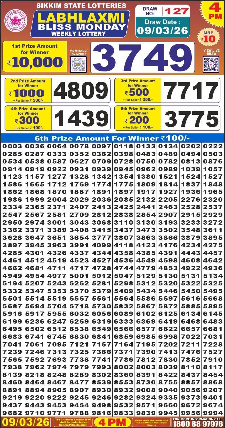 Labh Laxmi Bliss Monday Weekly Lottery 09.03.26 4pm Result March 9, 2026 Leave a Comment on Labh Laxmi Bliss Monday Weekly Lottery 09.03.26 4pm Result Get Instant Results on Whatsapp Related Articles 0 92 Labh Laxmi Glad Thursday Weekly Lottery 26.03.26 4pm Result 0 878 Labh laxmi Delight Wednesday Weekly Lottery 23.4.25 4pm result 0 742 Labh laxmi glow Friday weekly lottery 17.1.25 4pm result 0 52 Labh Laxmi Charm Tuesday Weekly Lottery 14.04.26 4pm Result