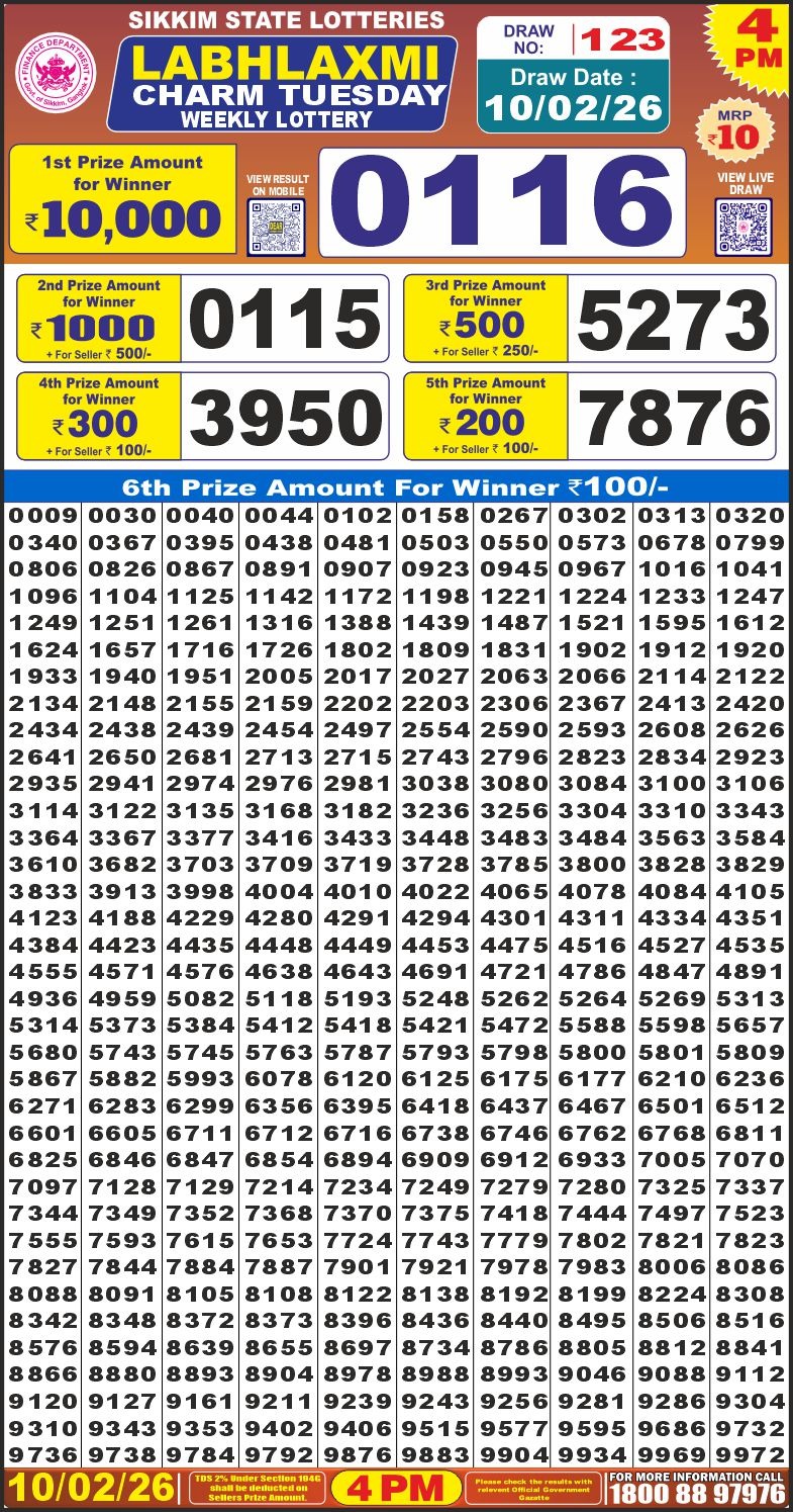 Labh Laxmi Charm Tuesday Weekly Lottery 10.02.26 4pm Result