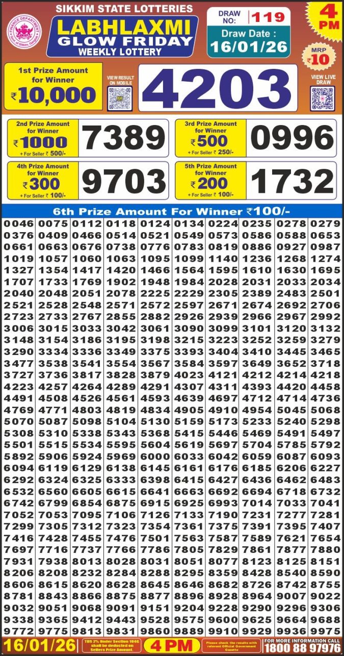 Labh Laxmi Glow Friday Weekly Lottery 16.01.26 4pm Result