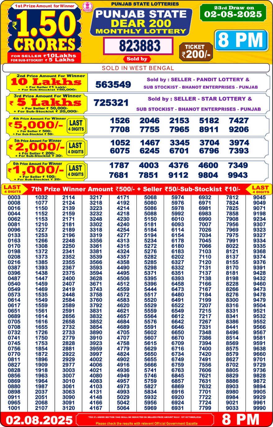 Punjab State 200 Monthly Lottery Result – 8PM Draw Today 2.8.25 | Win ₹1.5 Crore Jackpot From Sold Tickets Only!