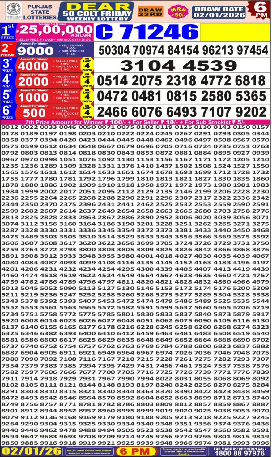 Punjab State Dear 50 Colt Friday Weekly Lottery 02.01.26 6pm Result January 2, 2026 Leave a Comment on Punjab State Dear 50 Colt Friday Weekly Lottery 02.01.26 6pm Result Get Instant Results on Whatsapp Related Articles 0 546 Punjab state dear 10 lottery 22.4.25 6pm result 0 521 Punjab State Dear 10 friday Weekly Lottery 21.3.25 6PM Result 0 100 Punjab State Dear 50 Buster Weekly Lottery Result,6pm,07.01.2026 0 340 Punjab State Dear 10 Thursday Weekly Lottery 24.07.25 6PM Result