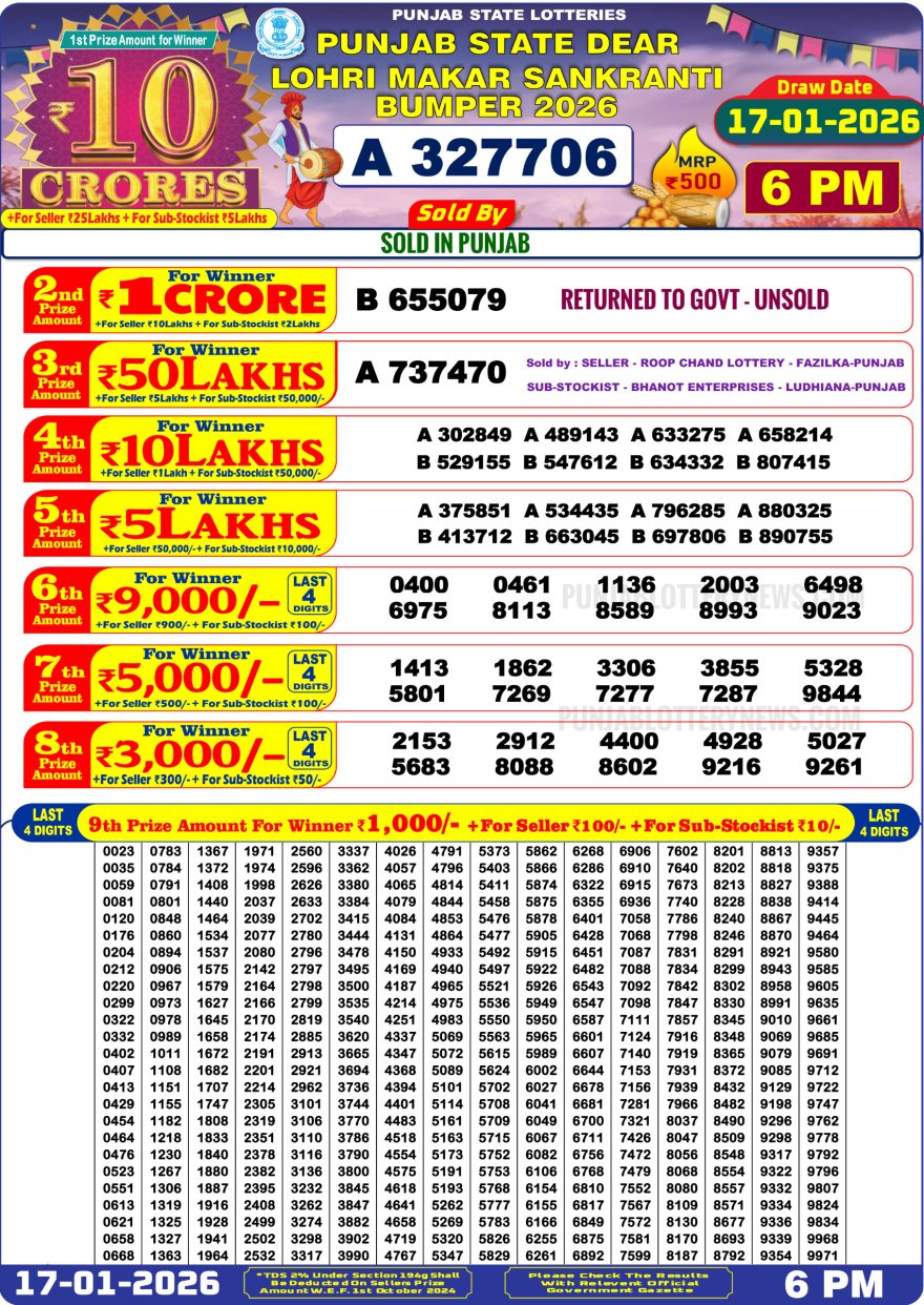 • Punjab State Dear Lohri Bumper Lottery Result 2026 Today